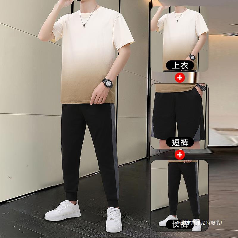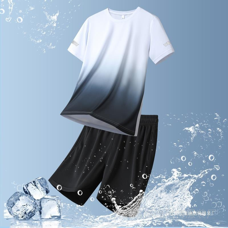 夏の氷の糸の3つのセットは男性の薄いタイプの速乾の通気性の丸首の運動のスーツのグラデーションのズボンの半袖の半ズボンを詰めて休みます。