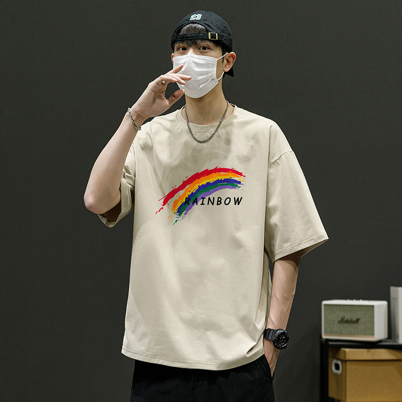 2024夏半袖tシャツ男性起爆虹プリント落肩丸襟氷糸運動半袖ゆるい五分袖