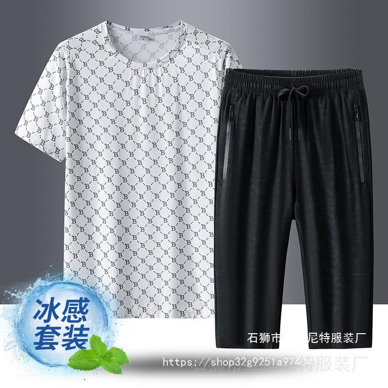 アイス半袖スポーツカジュアル7分丈パンツセット男性夏の薄い通気性のある肌に優しいtシャツパンツ2枚