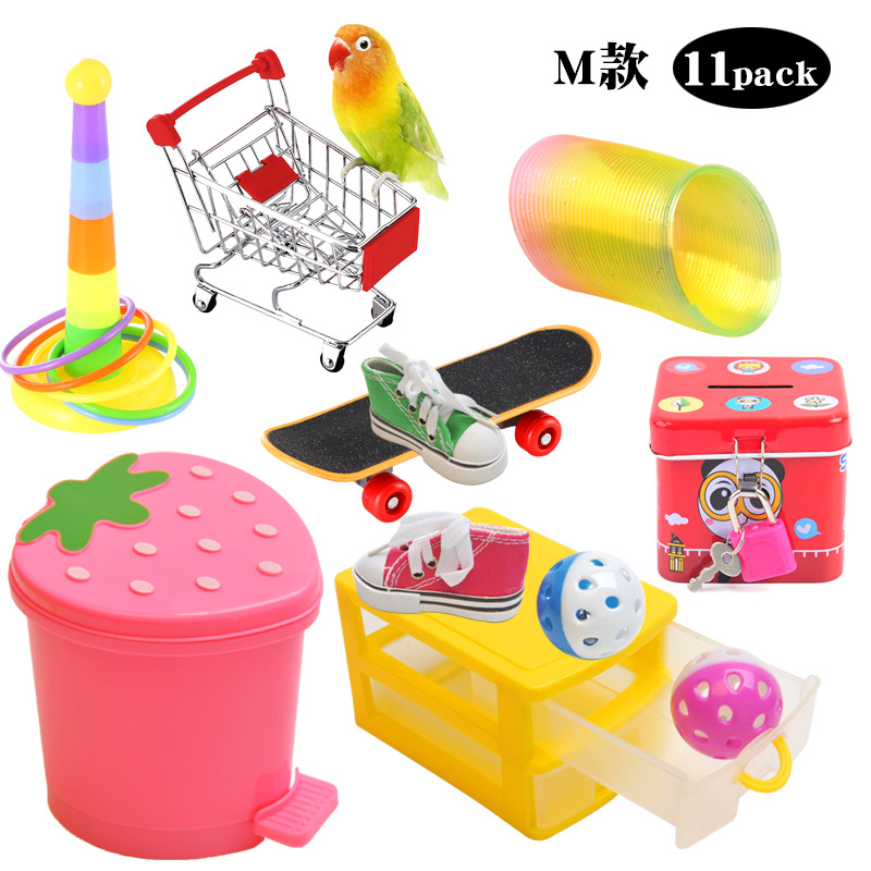 オウムのおもちゃ11点セットのオウムのトレーニングインタラクティブセットのアマゾンの鳥用品のスケートボードのショッピングカートのベルボール