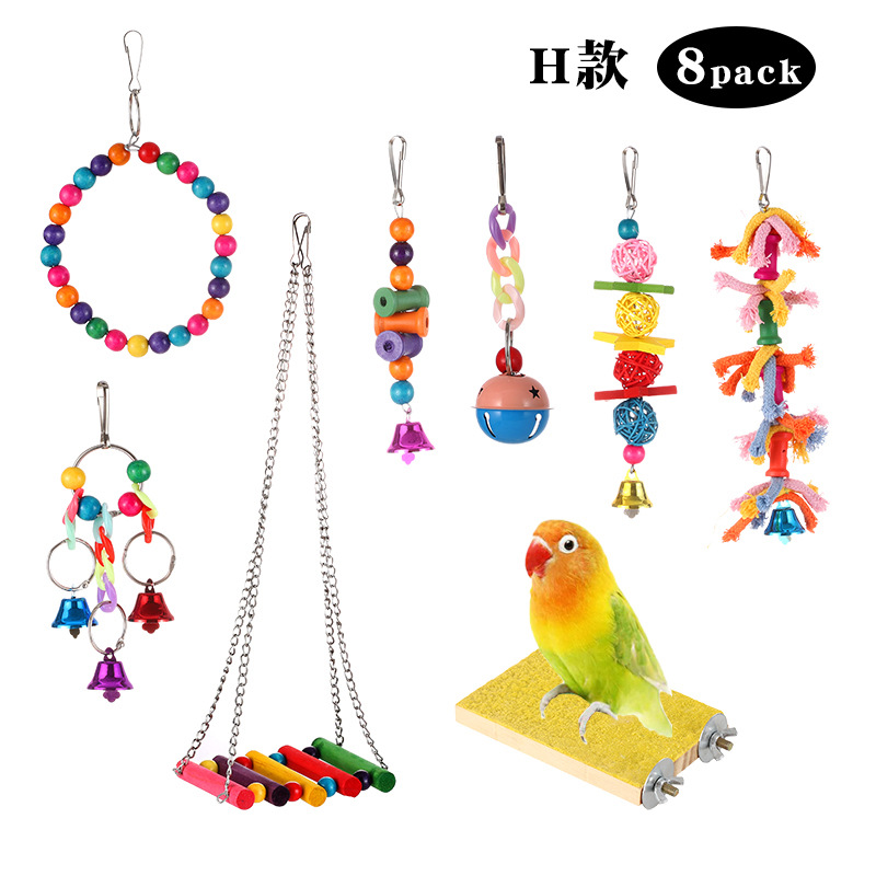 オウムのおもちゃ8点セットのケージオウムが鈴をかじっている木橋ブランコ駅の鳥用品が国境を越えて卸売りされている