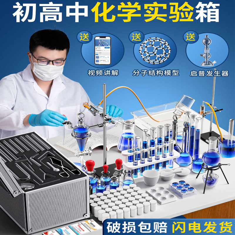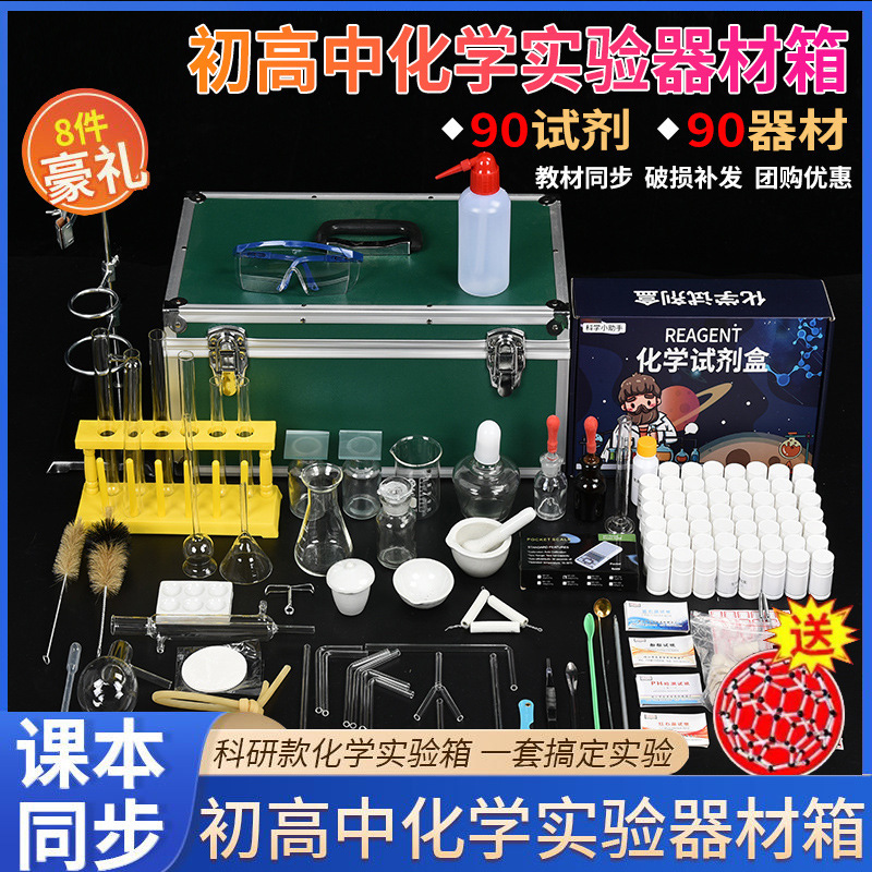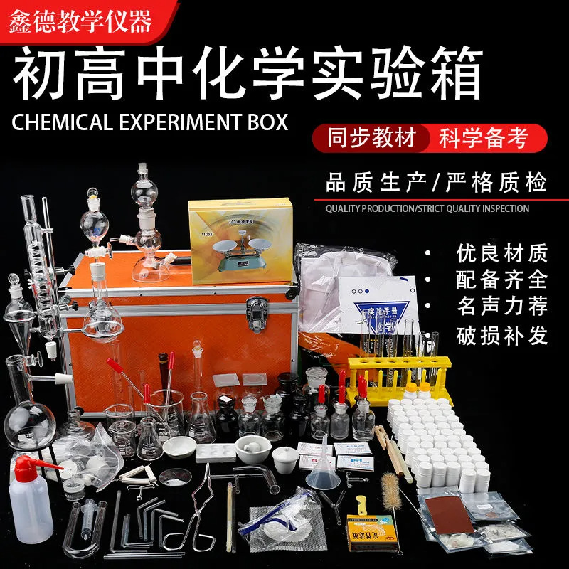 中学校の化学実験箱の全セットの化学実験器材の中で実験ガラス器材の化学試薬セットを試験します。