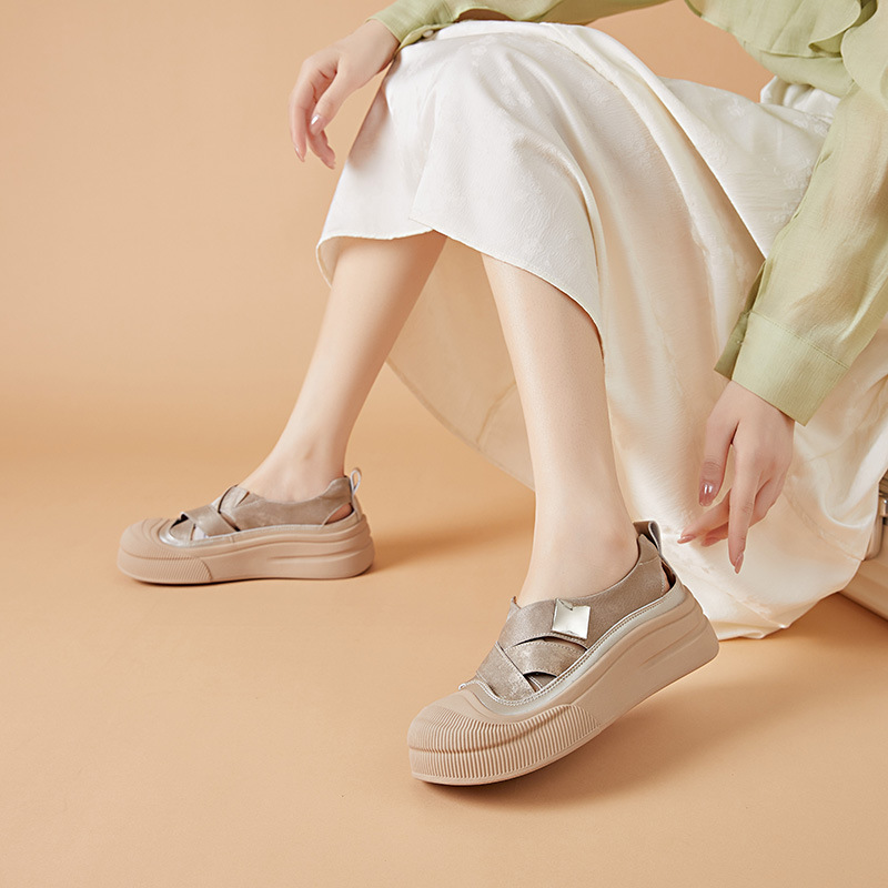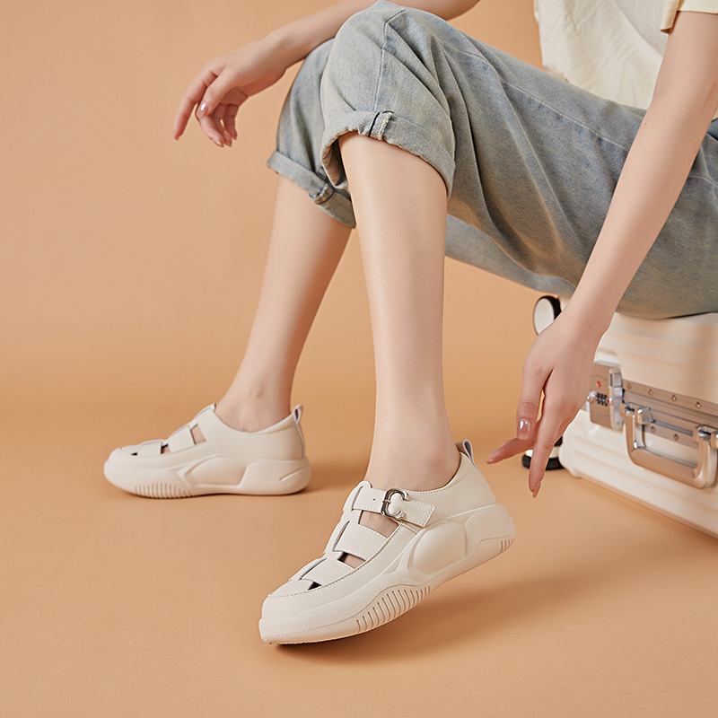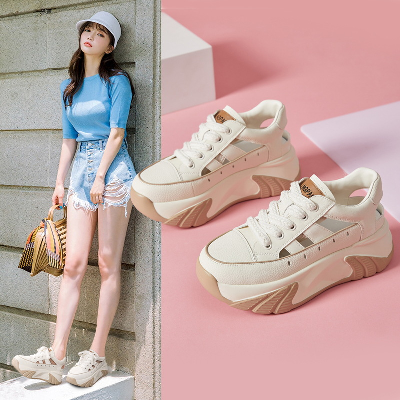 厚い底の本革の透かし彫りのサンダルの女性の2024夏の新型のファッションの潮流は百合の快適なカジュアルシューズの学校の爆発金になります。