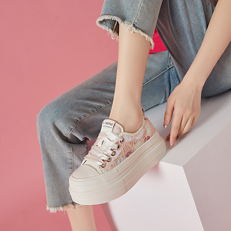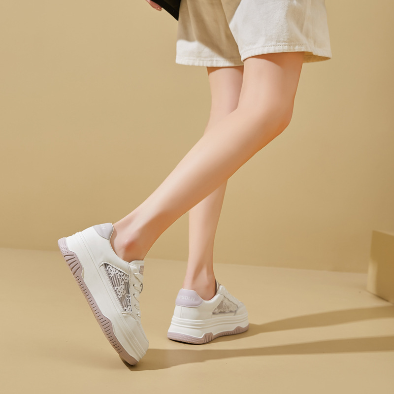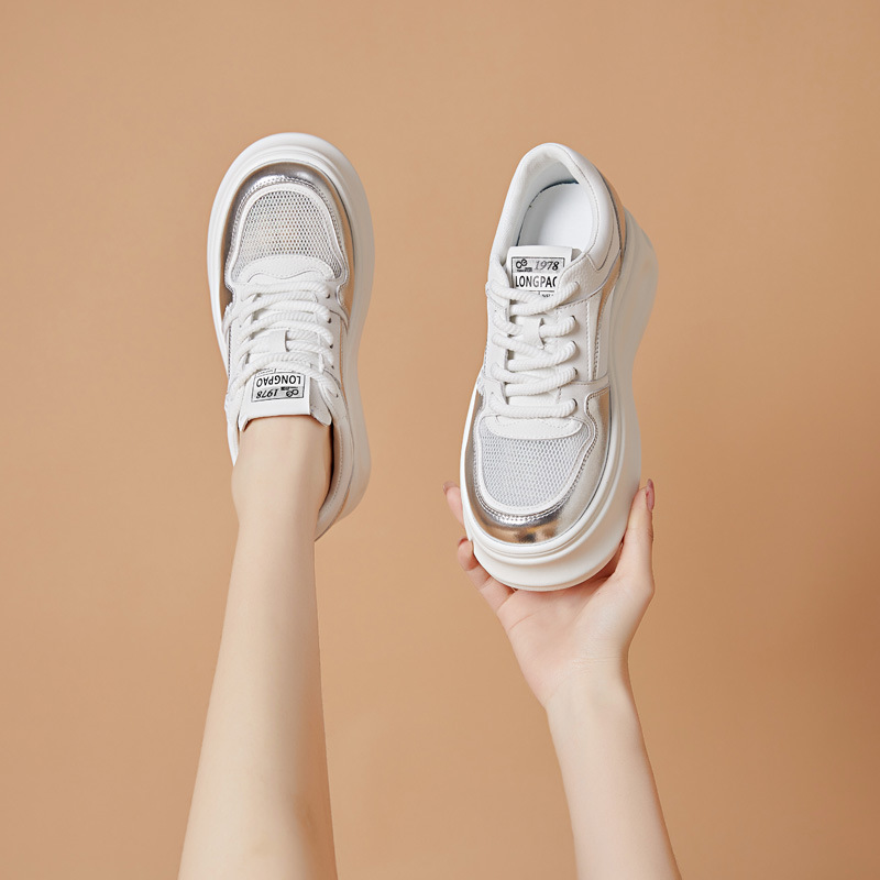 ファッションの厚い底の高くなるレースのネットの白い靴の2024夏の新型の通気性の百合のカジュアルシューズのキャンパスの爆発金