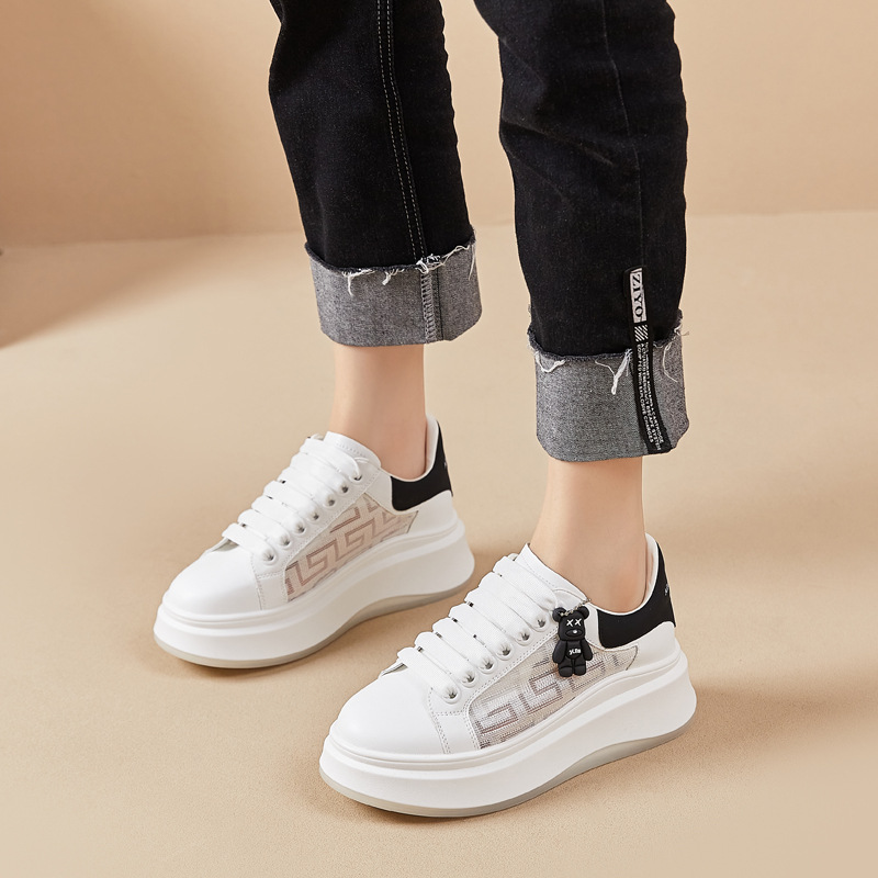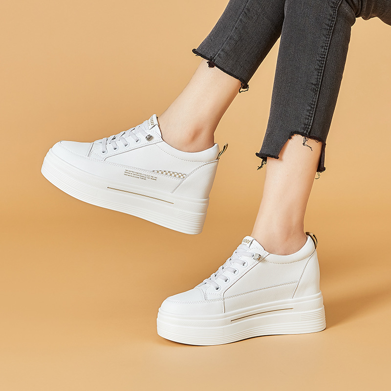本革の中で高くなったネットのカジュアルシューズの女性2024夏の新型通気性が軽い8cmファッションの白い靴のファッション靴