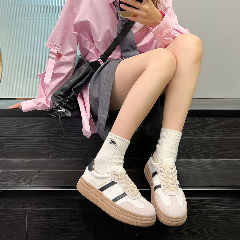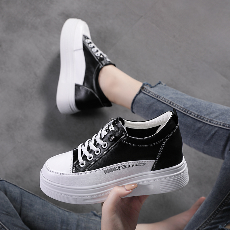 女性用の白い靴、本革の厚底、学生向けの身長を伸ばす道徳訓練靴、2025年春夏のホットスタイルの平底カジュアルで多用途なスポーツシューズ