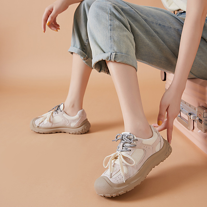 本革厚底ファッションカジュアルシューズ女性用2025夏新作軽量多用途通気性メッシュダッドシューズトレンド