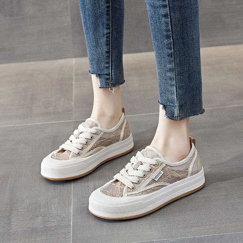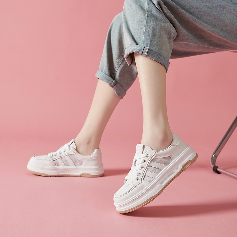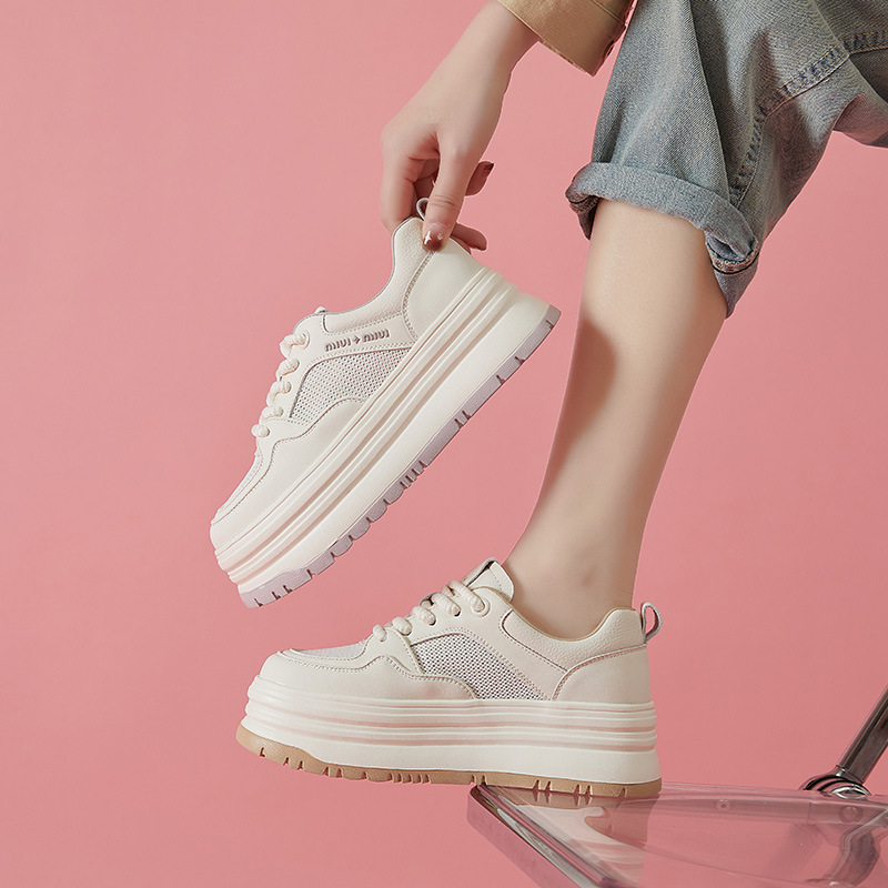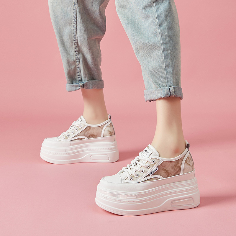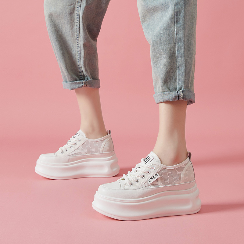 新しい本革の厚い底が高くなりました。通気性ネットのカジュアルシューズの女性2024夏のキャンパスは軽くて快適です。