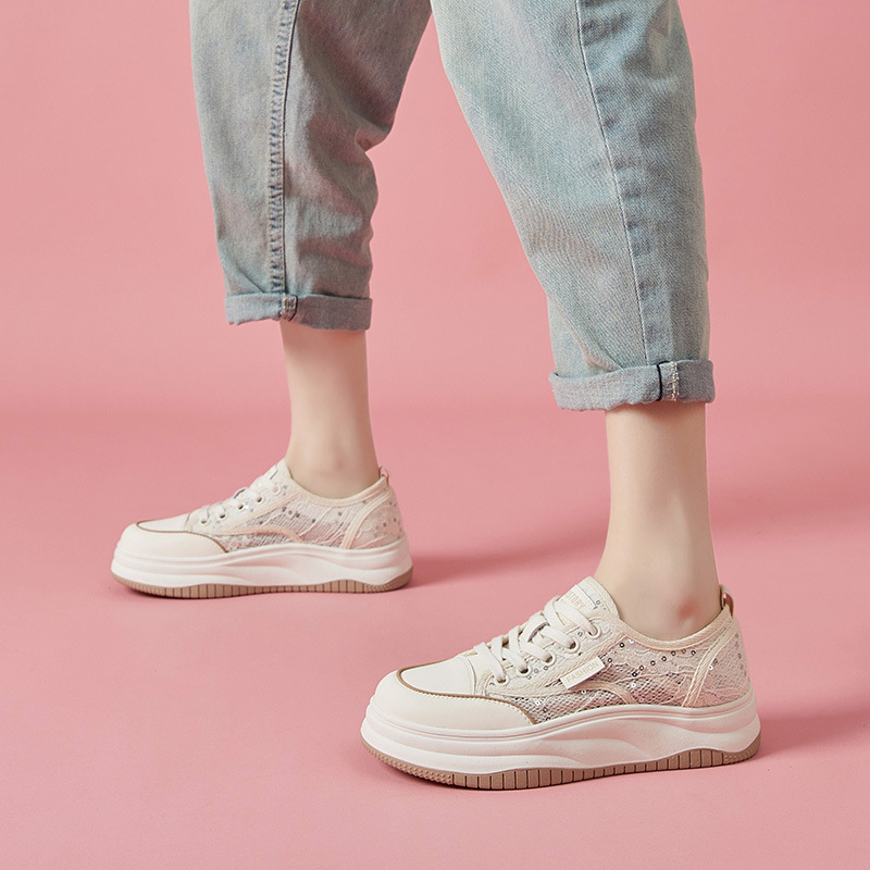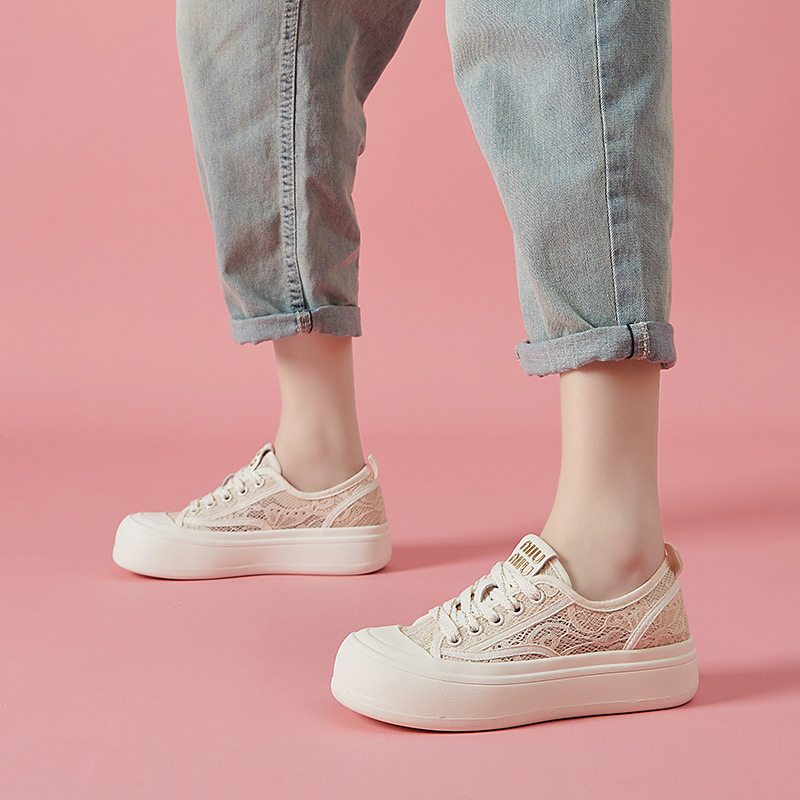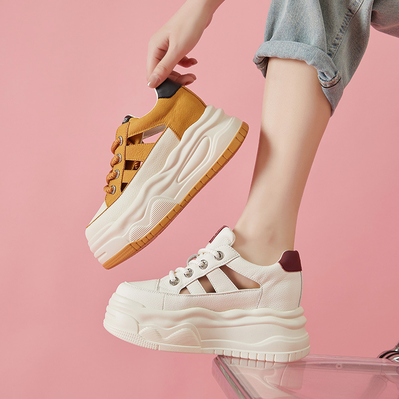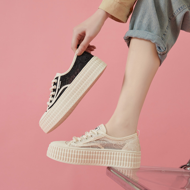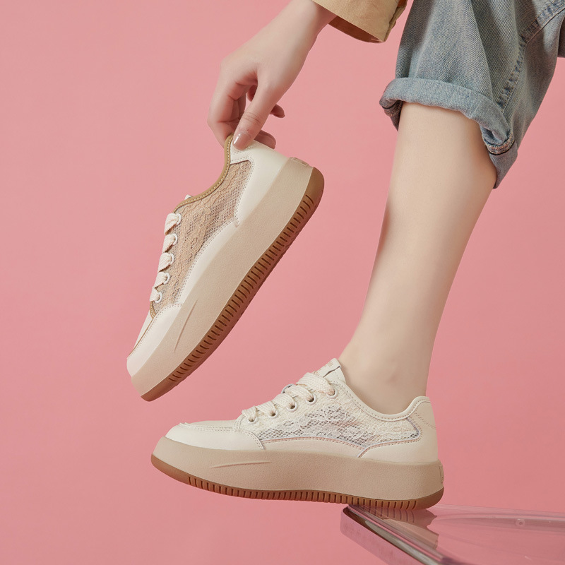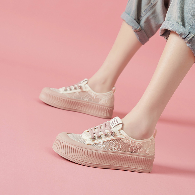新しい本革の厚い底が高くなりました。通気性ネットのカジュアルシューズの女性2024夏のキャンパスは軽くて快適です。