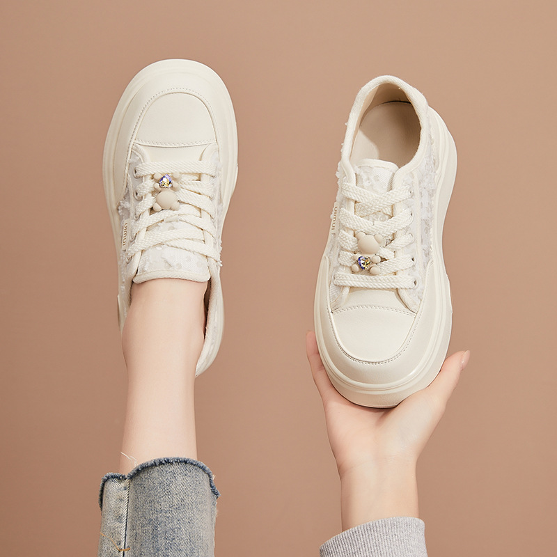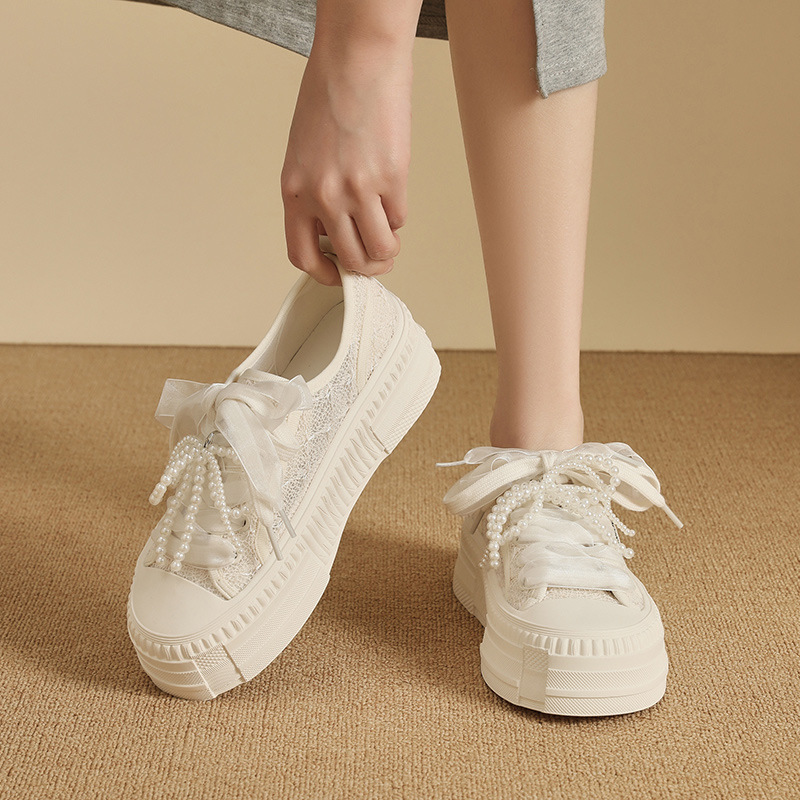 レーススポーツレジャー板靴女性靴2025春夏の新型高さの厚い底のネットの通気性の柔らかい底の蝶結び