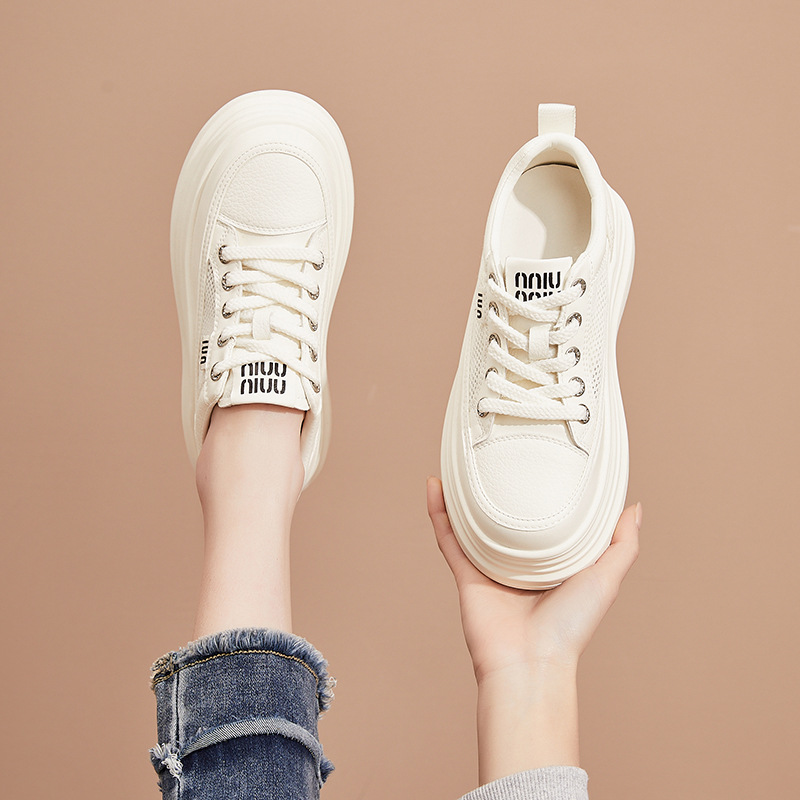 白い靴の女性は2025年に新しい春に本革の通気性の厚い底の軽い運動靴の靴のカジュアルな板の靴を合わせます。