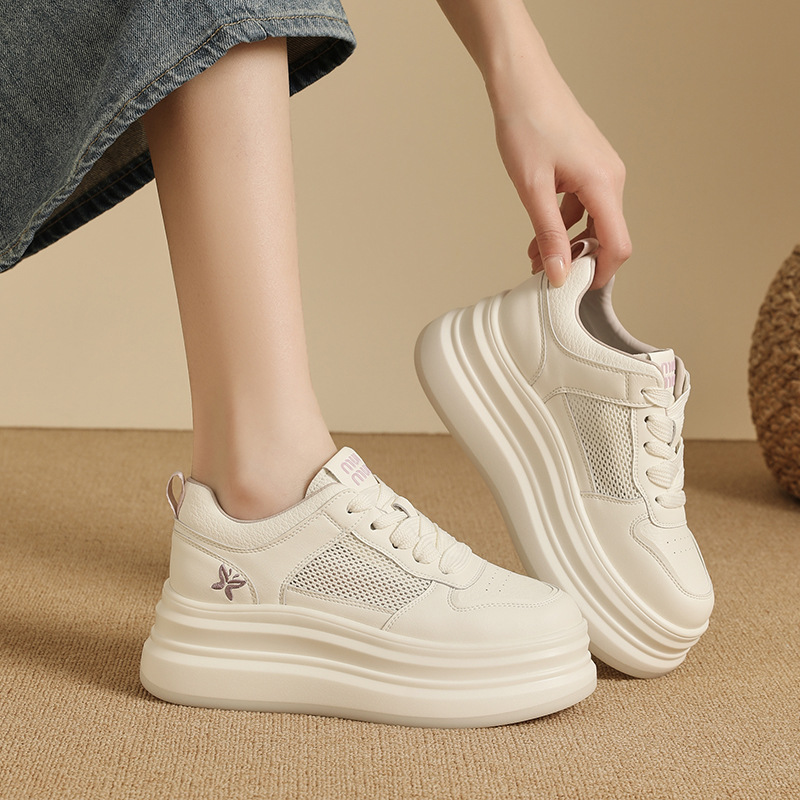 2025年春夏新作 厚底メッシュ通気性シェルトゥスニーカー レディース ホワイトシューズ 韓国風 カジュアルシューズ
