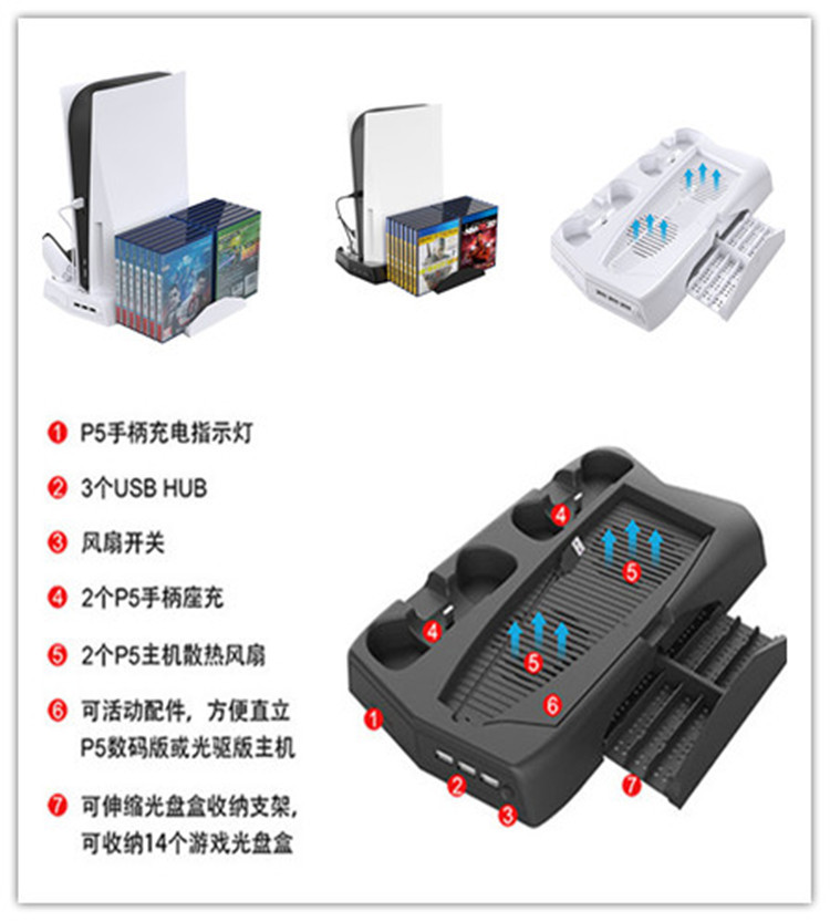 現物ps5放熱ファンベースヘッドホンラックp5ハンドル付き接点式二重充電 + ディスク収納ラック