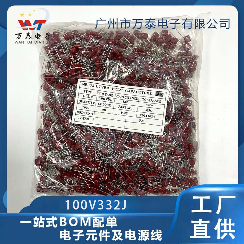 Cbbコンデンサー332j 100v 3300pf 5% ポーラーレス金属膜コンデンサーp = 5mmピッチ
