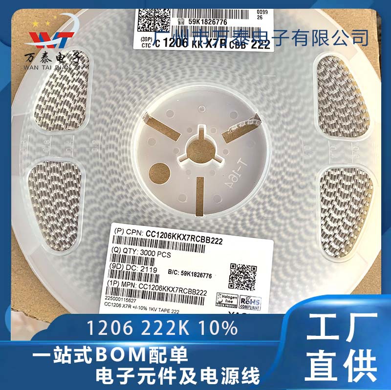 国の巨大なパッチのコンデンサー1206 222 2.2nf 10% 1kv cc1206 kkx 7 rbb222コンデンサー