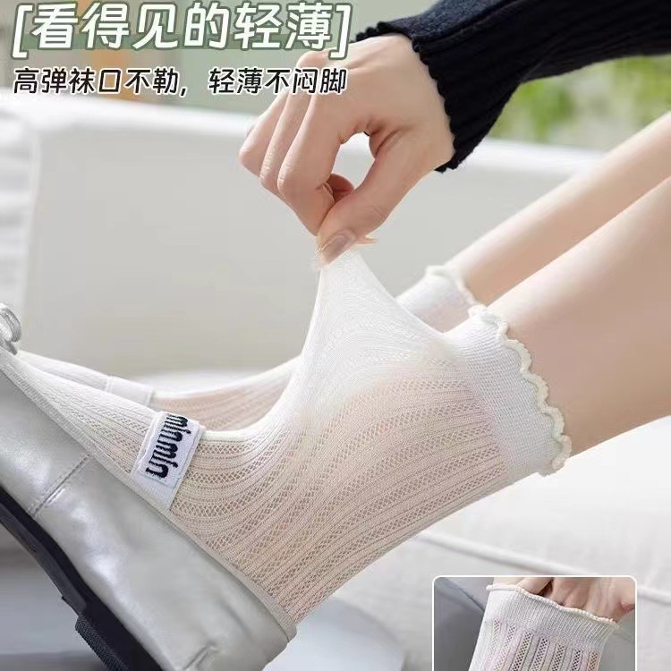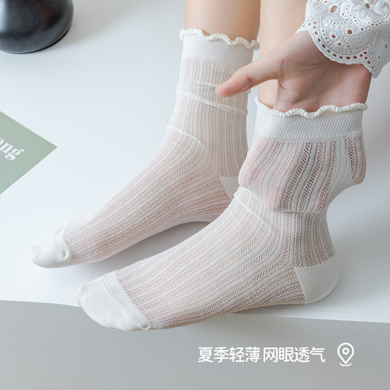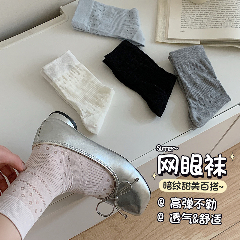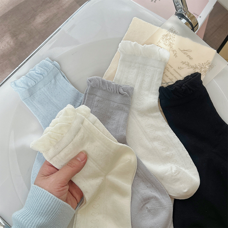 春夏の女性用薄い無地パイルソックス韓国風甘い女の子中空オールインワンボーンレスミッドハイコットンソックス