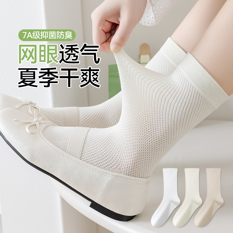 绢糸凉感靴下女性夏の薄いタイプの微圧中筒靴下防臭抗菌山白い氷ストッキング