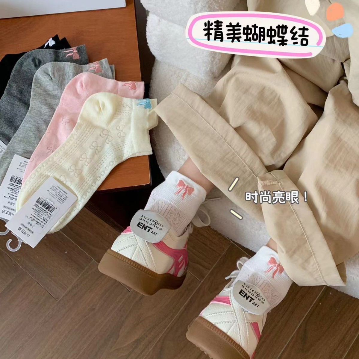 蝶結びの靴下の女性のかかとの刺繍のソックスの女性の純綿の夏の薄いタイプの透かし彫りの通気性の白いソックスの夏