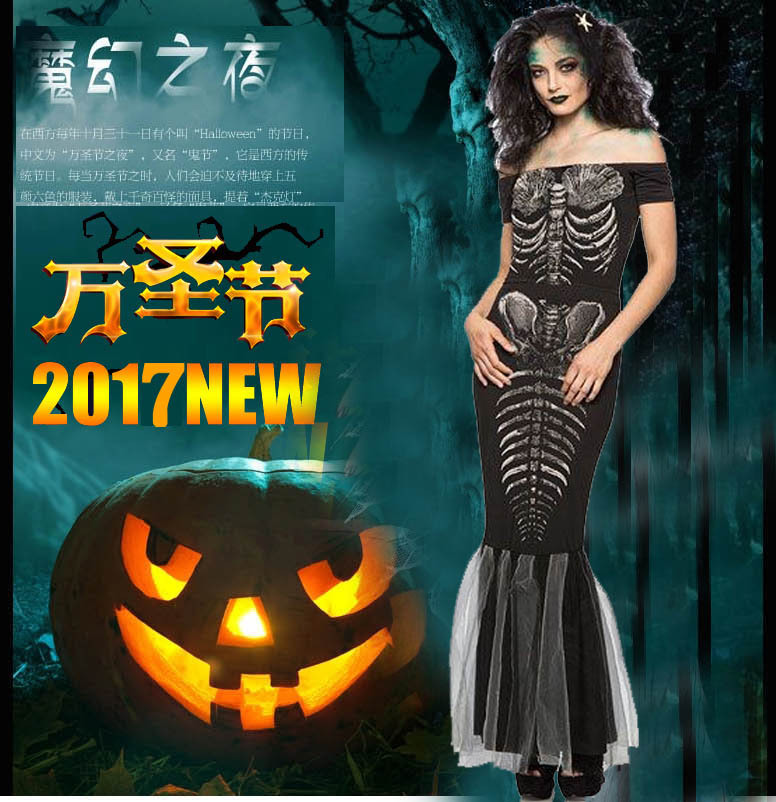 ハロウィンのスカルの服の美人の舞台の演出の服装の1字の襟のハロウィンのバーのパーティーの服の魚の尾の服