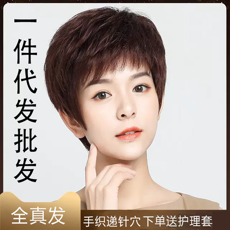 女性用ウィッグ、手編み三号ネット、梨花パーマ、本物の髪、自由に分けられるウィッグセット、軽くて通気性があります。