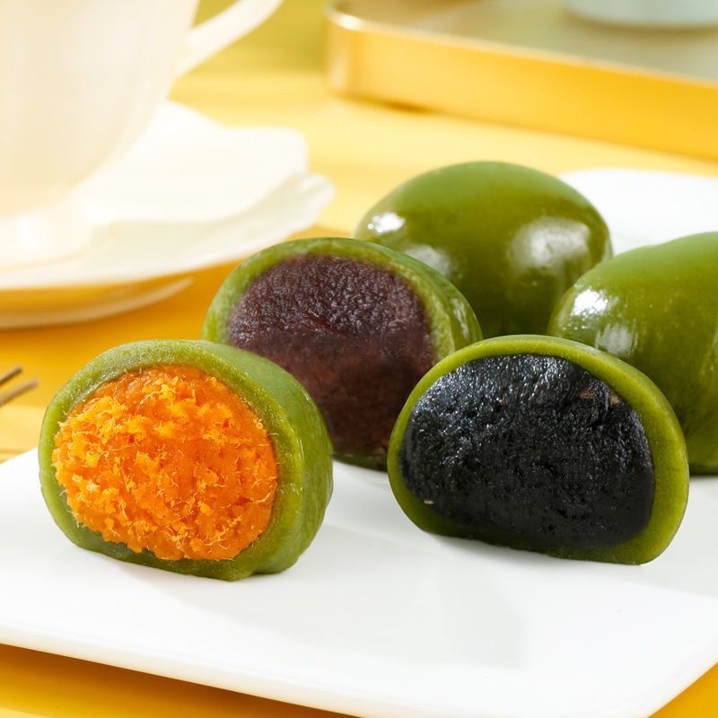 艾青汁餅団卵黄肉松 _ 豆沙黒胡麻果特色麻芋雪媚娘菓子軽食