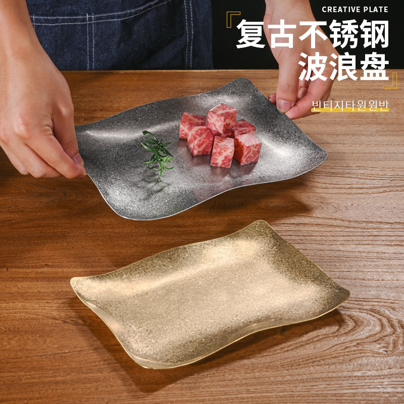 レトロなステンレス鋼の長方形の波状プレート商業デザートスナックフラットプレートレストランバーベキューバーベキュー特殊形状皿