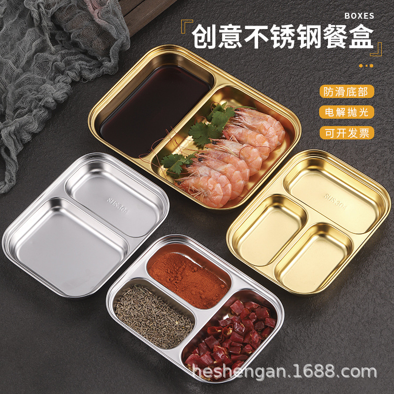 卸売り金色韓国式食器304ステンレス料理皿分格軽食調味料料理幼稚園学生弁当箱