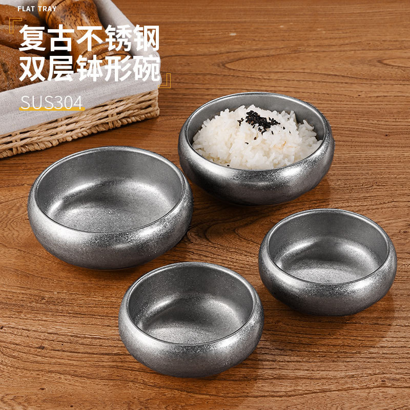 レトロ304ステンレス鉢の形の碗は古い業務用の調味料の碗の2層を作って子供の食事を防ぎます。