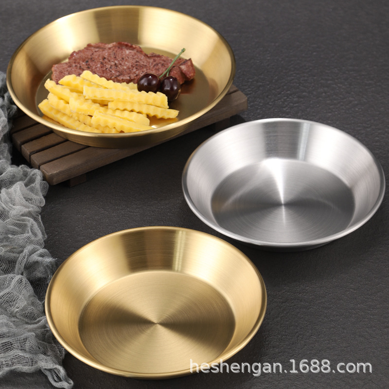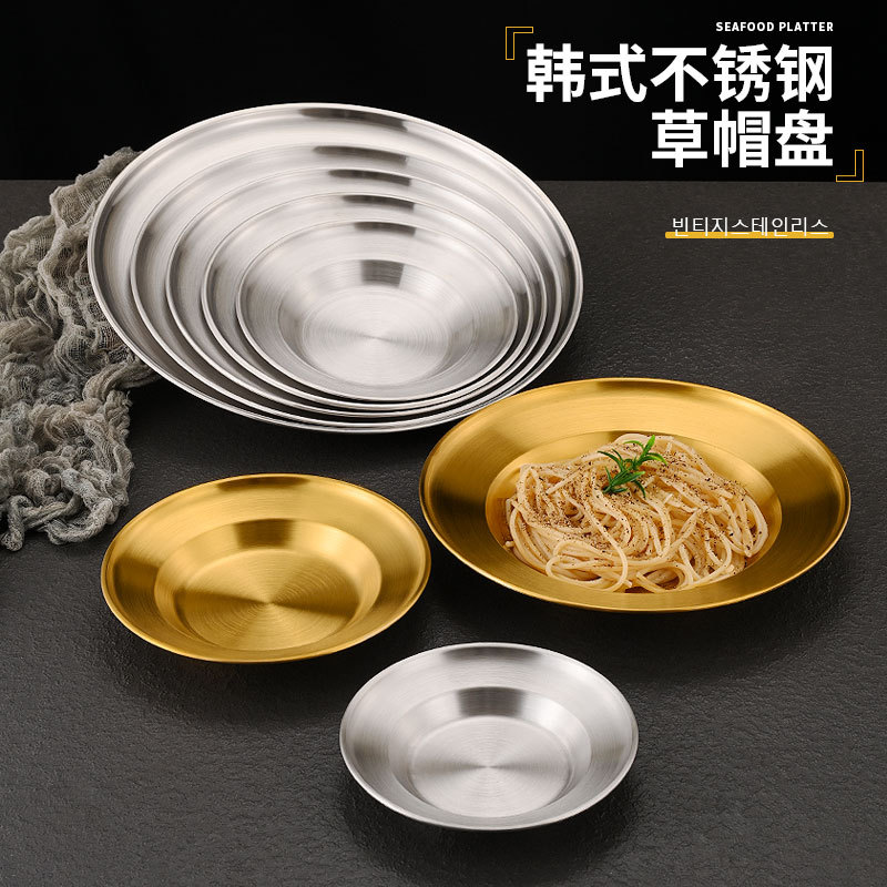 韓国風の厚みのあるステンレス鋼の麦わら帽子皿は、ホテルの洋食バーベキュークリエイティブゴールデンデザート平底浅い皿に直接供給されます
