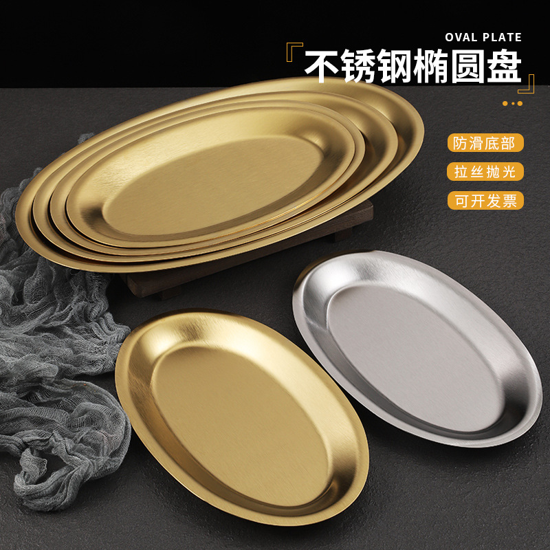韓国ステンレス鋼楕円形プレート卵型厚みのある平底トレイゴールデン蒸し魚プレート野菜プレート商業バーベキュープレート食器