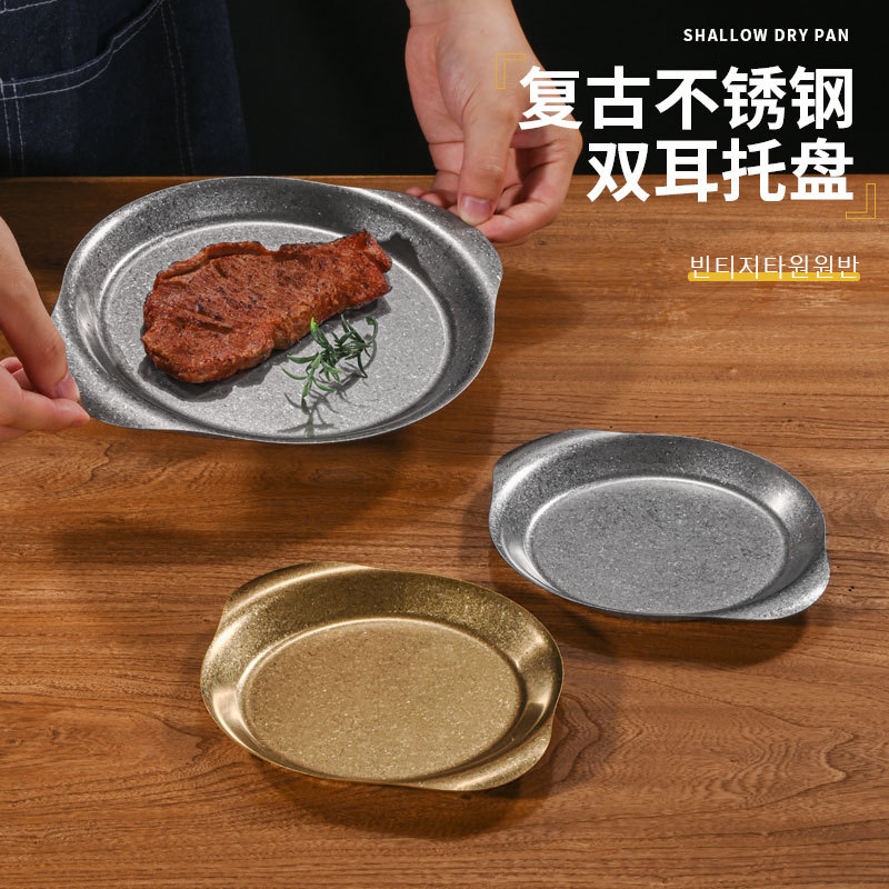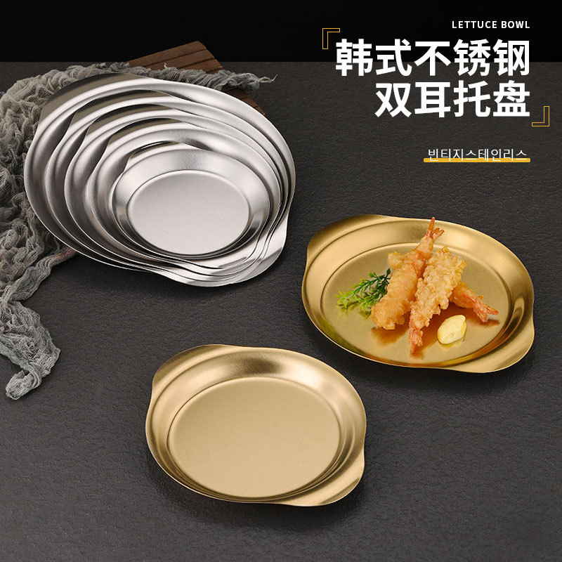 韓国式304ステンレス双耳トレー平底創意料理皿パスタ皿デザートフライドチキン円盤焼肉皿