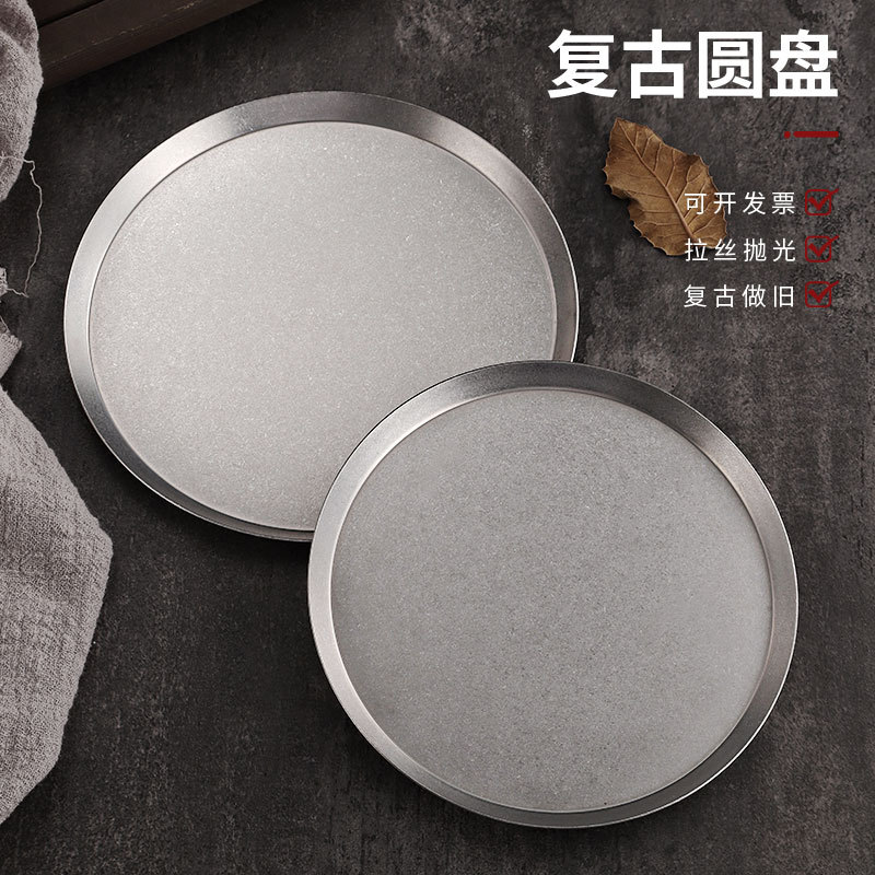 レトロなステンレスの円盤は古い浅い皿の平底のトレーの洋食の皿のデザートの皿のステーキの皿のオーダーメイドのlogoを作ります。