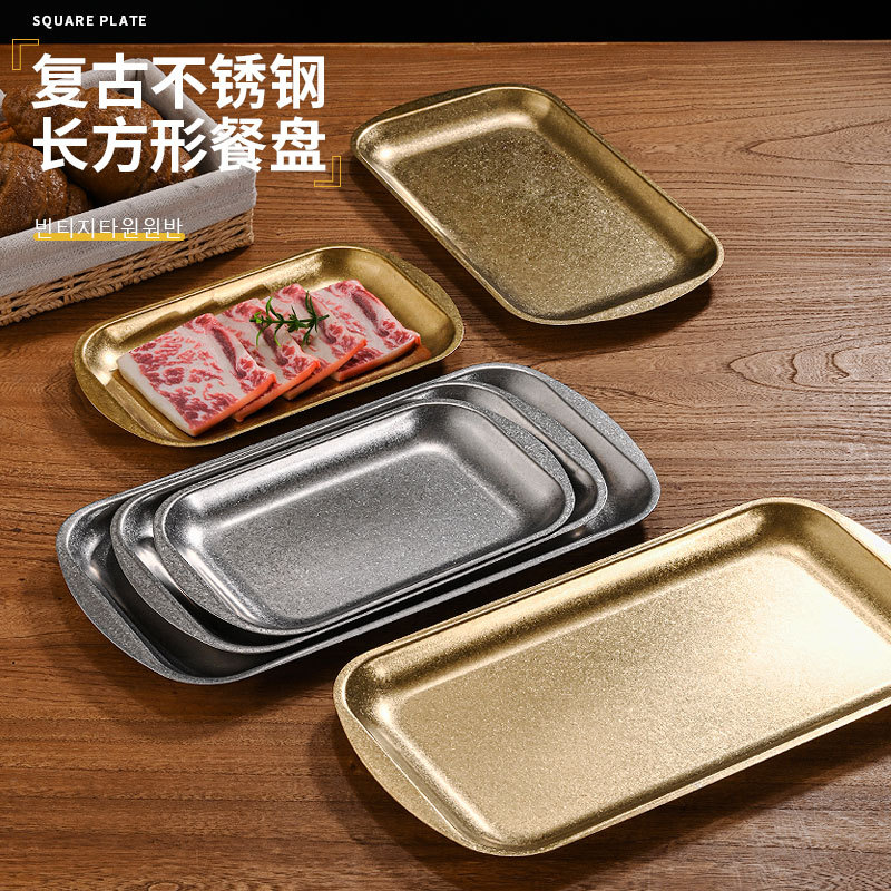 レトロなステンレス鋼の長方形バーベキュープレート厚みのある鍋レストランバーベキュープレート商業平底楕円形ゴールドトレイ