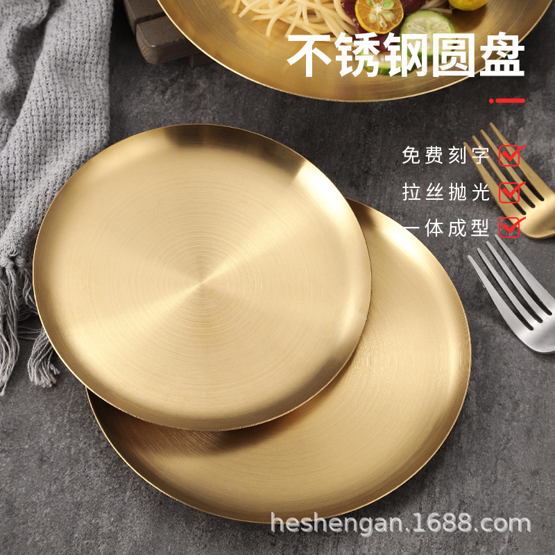 韓国式の厚いステンレスの円盤の金色の喫茶店のデザートのケーキのトレーの料理の皿は平皿を焼いて骨の皿を吐きます。