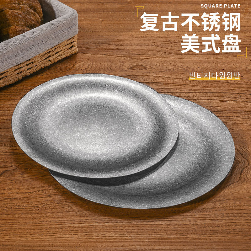 レトロなアメリカンスタイルのステンレス製丸皿、アンティーク加工されたインダストリアルスタイルのプレート、カフェ、ケーキ、デザートプレート、業務用バーベキュープレート