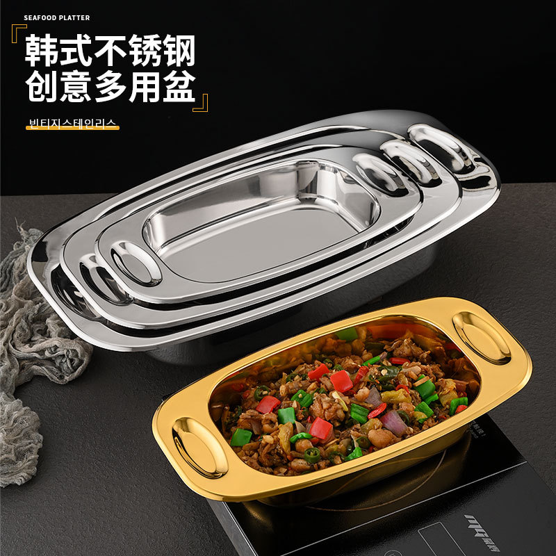韓国式焼き魚皿ステンレス深み長方皿商用乾燥鍋ザリガニ皿両耳電磁ストーブ平皿