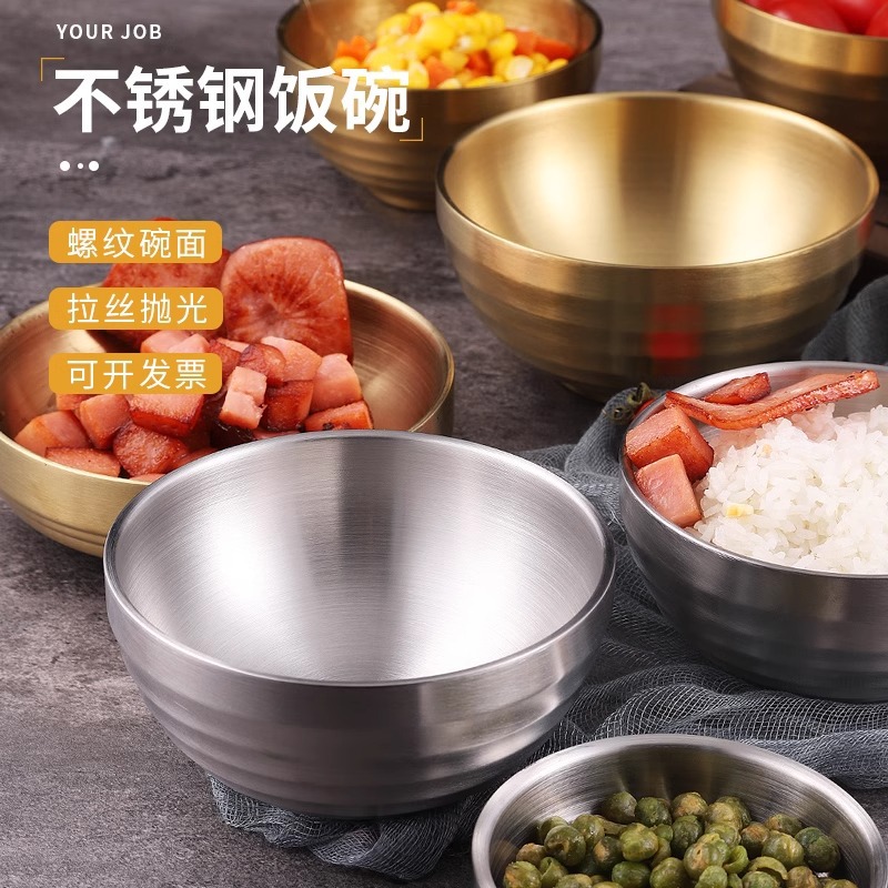304ステンレスの韓国式のご飯の碗の幼稚園のスープの碗のねじの紋様の金色の顔の碗の子供の二重の断熱の小さい碗