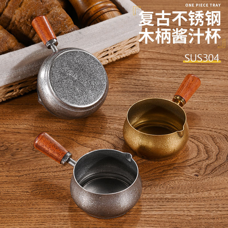 レトロ 304 ステンレス鋼ソースカップステーキ調味料カップ木製ハンドルトマトサラダディップソース洋食ソース皿
