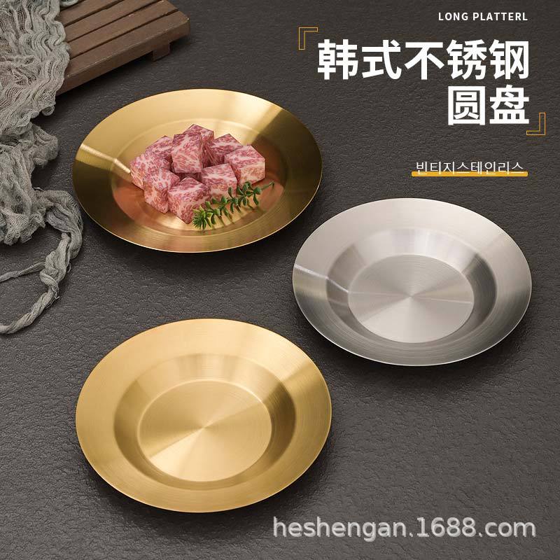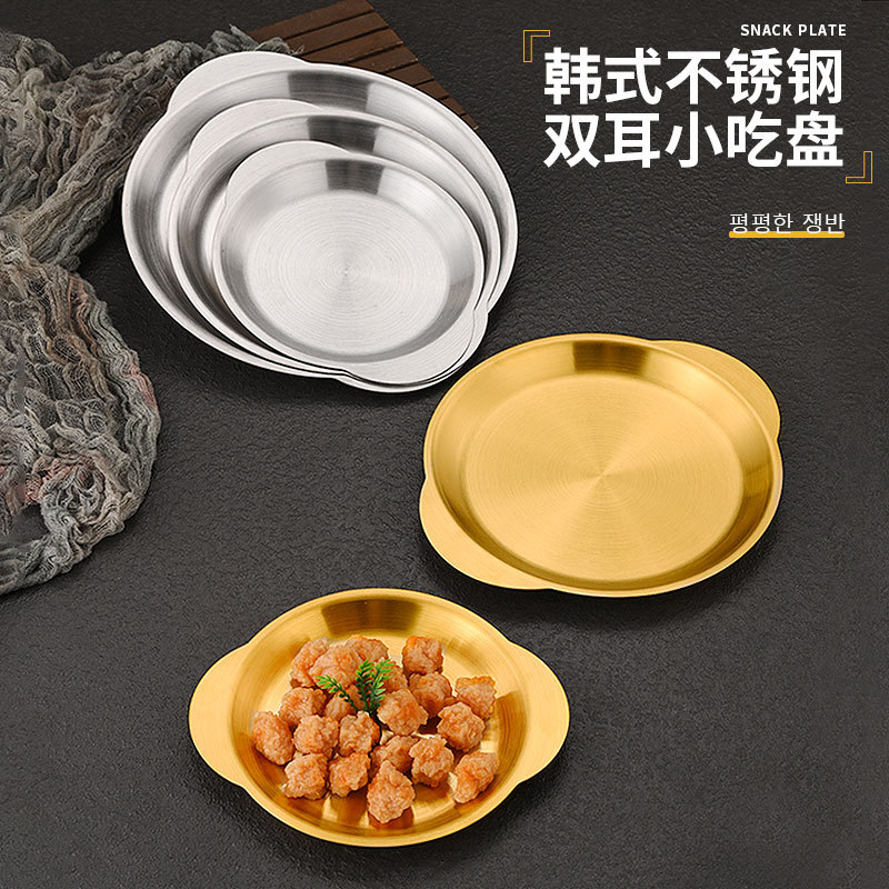 韓国式ステンレスの円形の軽食の皿は耳の浅い皿の焼肉の果物のお菓子の皿の家庭用の金色のお菓子の皿を持って卸売りします。