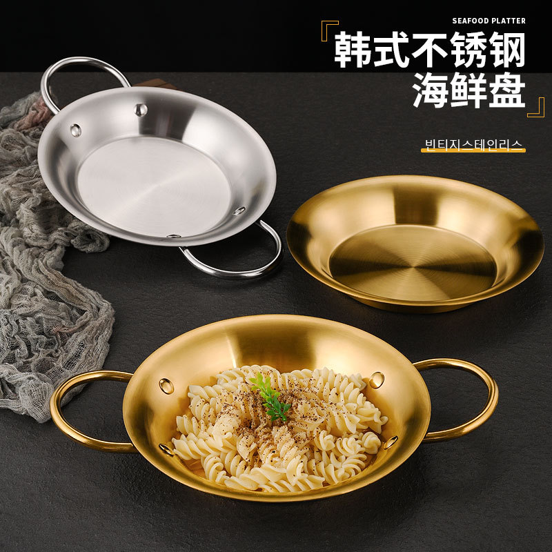 韓国式スペインステンレス海鮮皿グラタン鍋ロブスター皿両耳平底厚部隊鍋フライドチキン皿