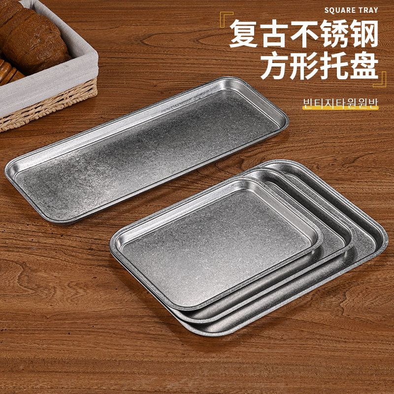 レトロ食事皿工業風ステンレストレー長方形フラットデザートケーキ小トレー収納浅い焼肉皿