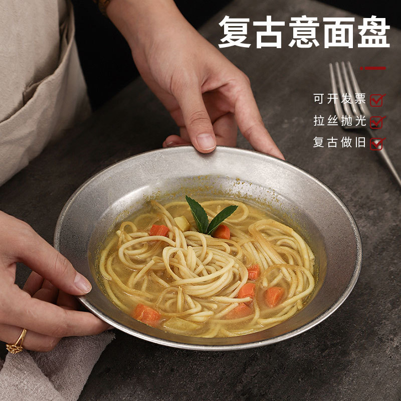 レトロなステンレスの麦わら帽子の皿の円形の深皿の洋食のステーキの皿は古いパスタの皿の商用注文のlogoを作ります。