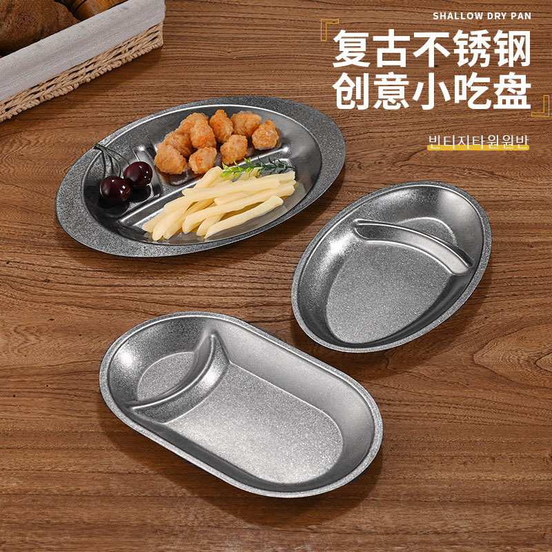 レトロなステンレスの楕円の円盤は古い喫茶店のトレーを作って鍋の料理の皿の金色の軽食の蒸し魚の皿の卸売りを焼きます。