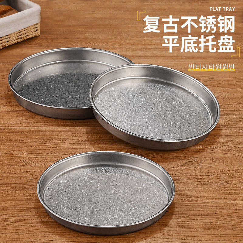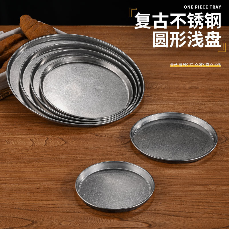レトロなステンレスの円形の浅い皿の商用の果物の皿のケーキは肉の皿の骨の皿の平底の料理の皿の卸売りを焼きます。