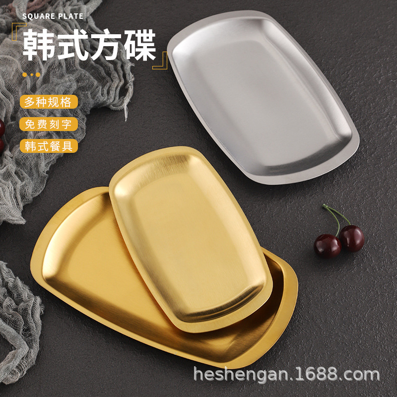 創意的な両耳のステンレスの四角形の皿の韓国式の金色のフライドチキンのフライドポテトの皿の平底の軽食のトレーのティラミスの皿