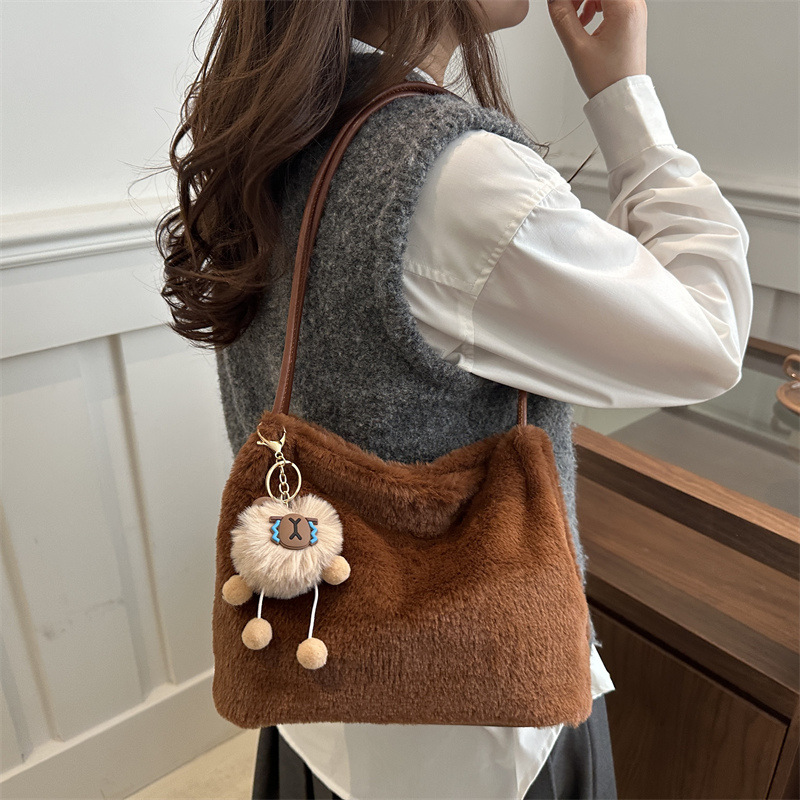 秋冬のぬいぐるみバッグの女性2024の新しいファッションは、毛羽立ちのバッグの大容量が軽くて、肩の脇のバッグに合わせています。