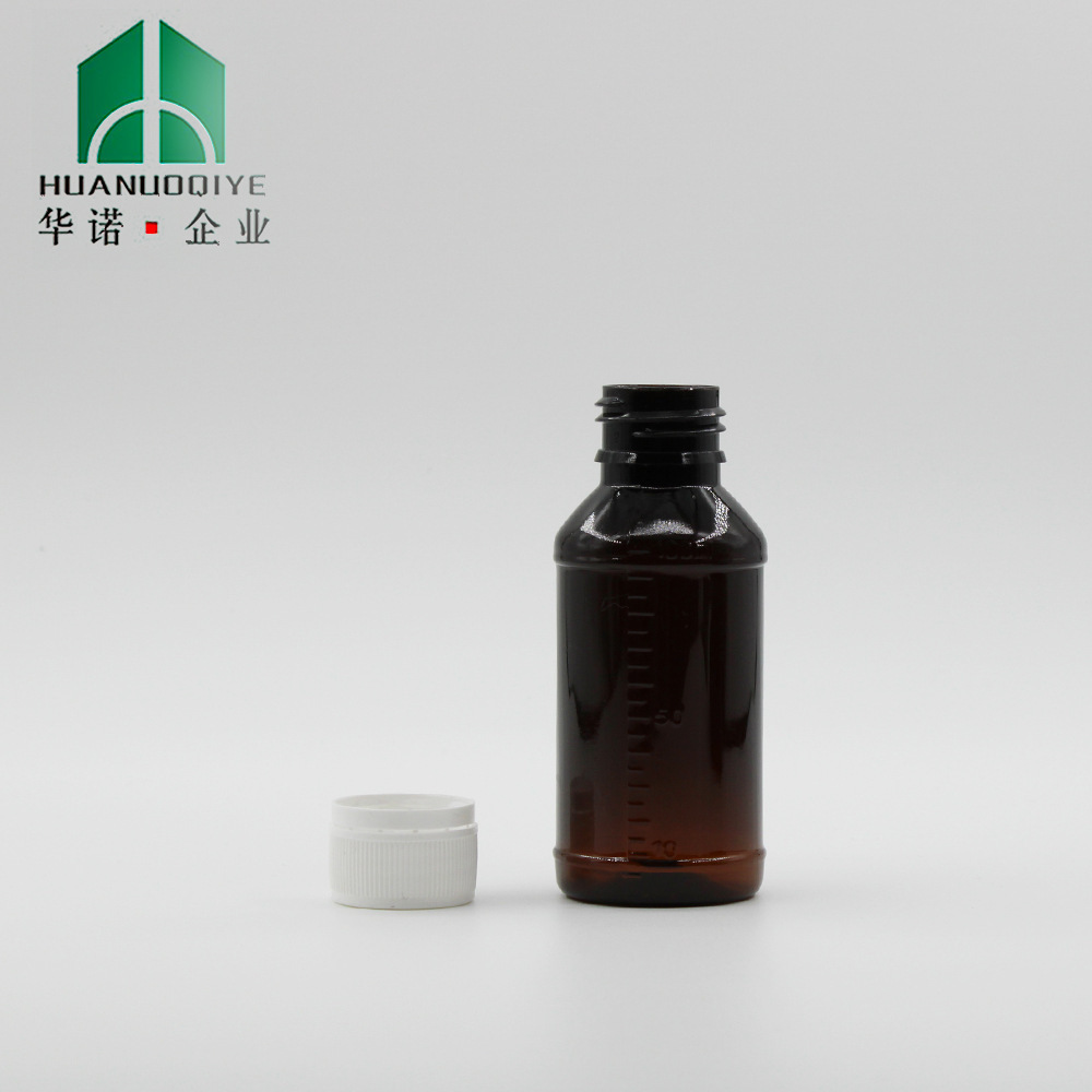 2025新型100mlペットボトル斜肩ポリエステルpet茶色保険蓋薬瓶目盛付きシロップ瓶
