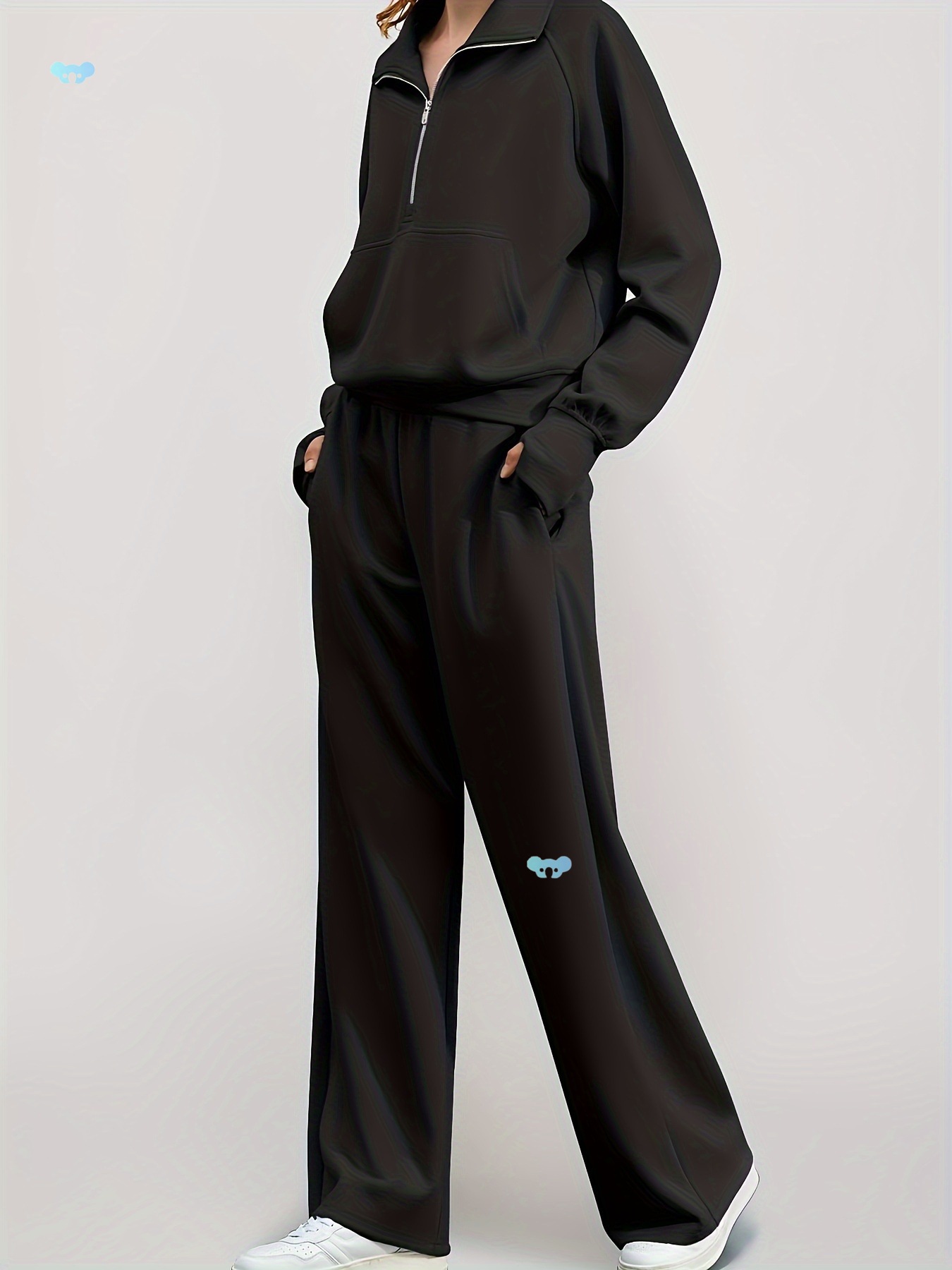レディース カジュアル ソリッド カラー パンツ セット 長袖 ハーフ ジップ