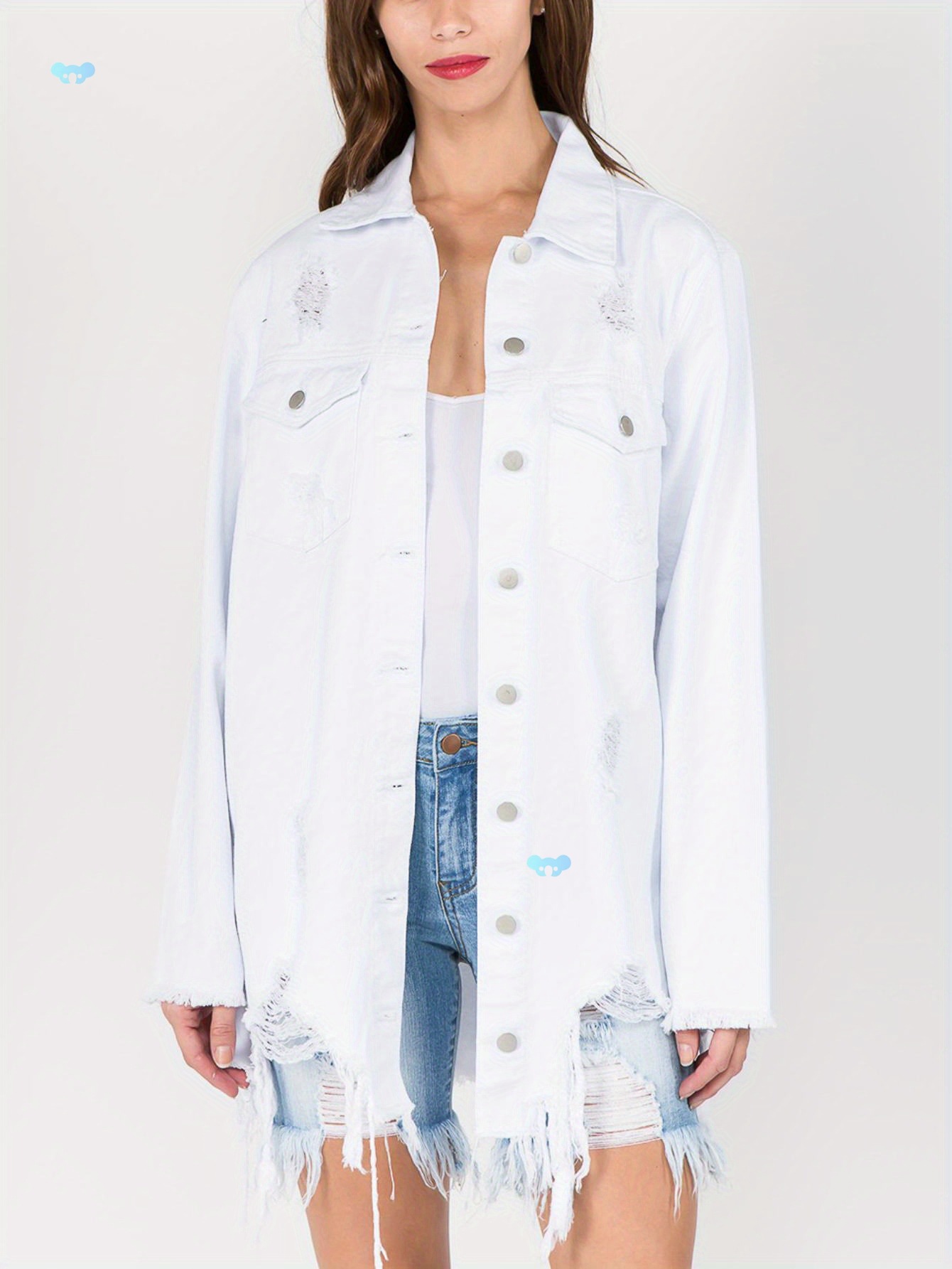 レディースカジュアルデニムジャケット トレンド ホワイト ダメージ加工 フリンジ