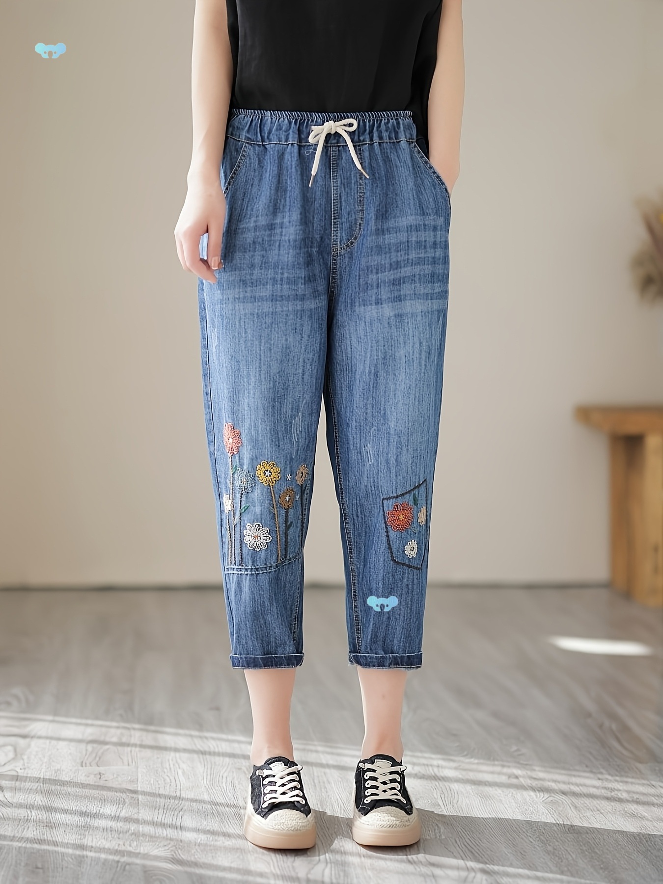 レディース エレガント 花柄 刺繍 カプリ ジーンズ 巾着